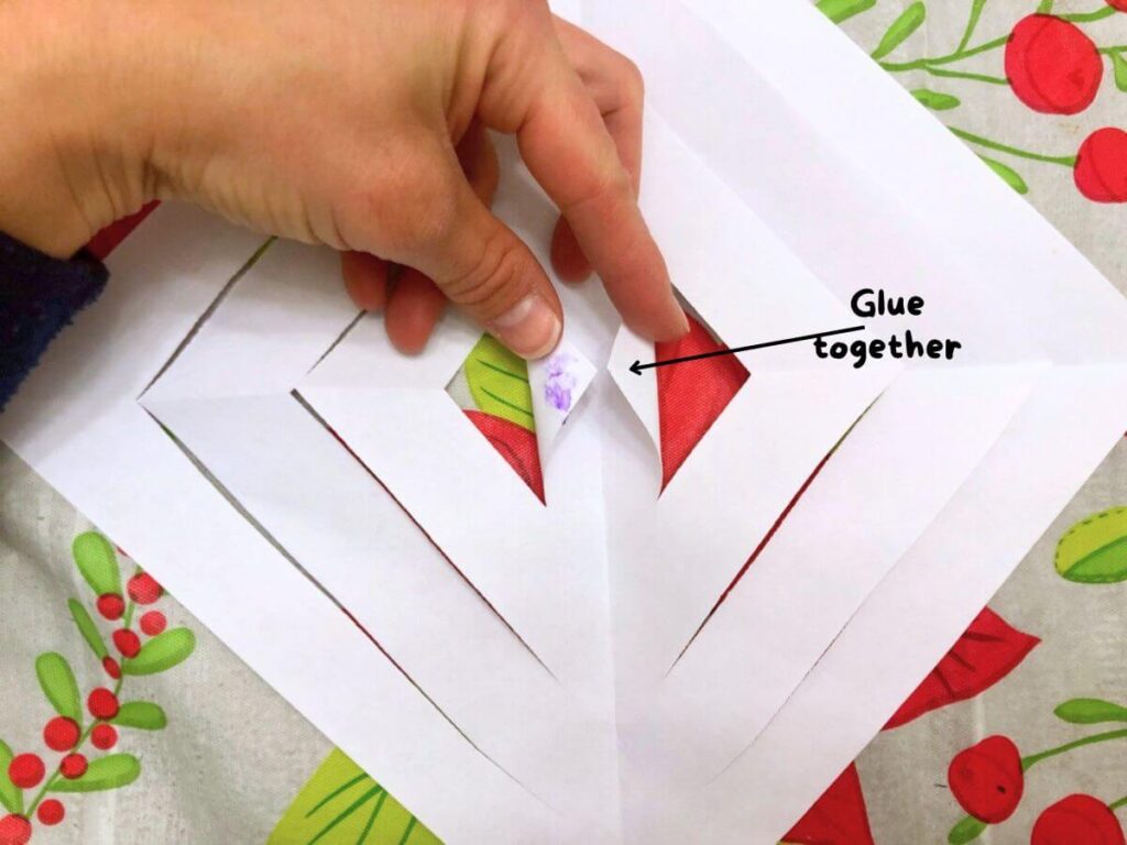 Take two sections of the snowflake and align the ends together on bottom. Glue them together (I glue about an inch of paper to get a good hold). Pinch the ends together until the glue has settled a bit.